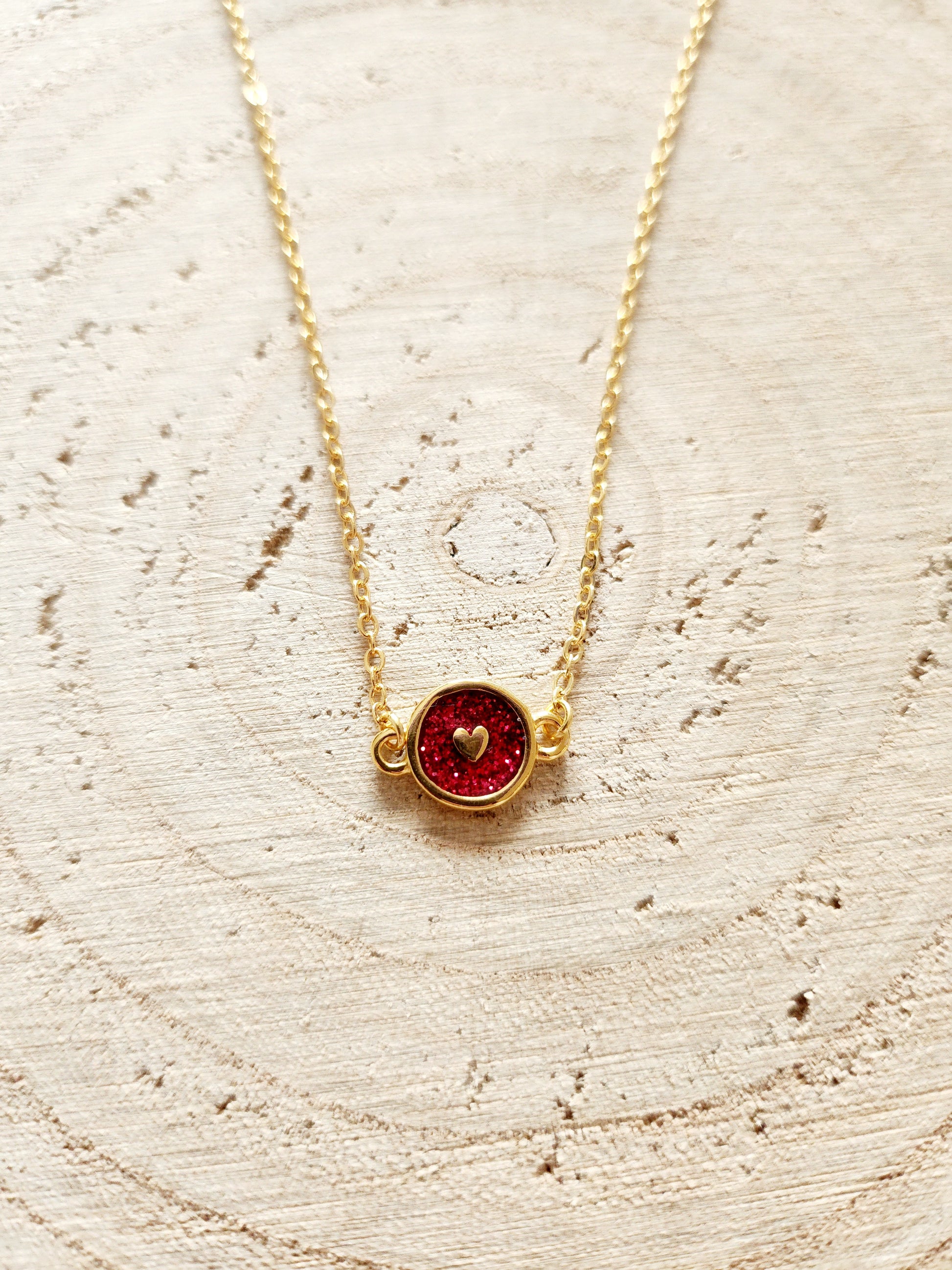 Célia est un collier fin en laiton doré à l’or fin, orné d’un pendentif connecteur en forme de cœur, en Zamak doré 24K, émaillé de rouge pailleté.