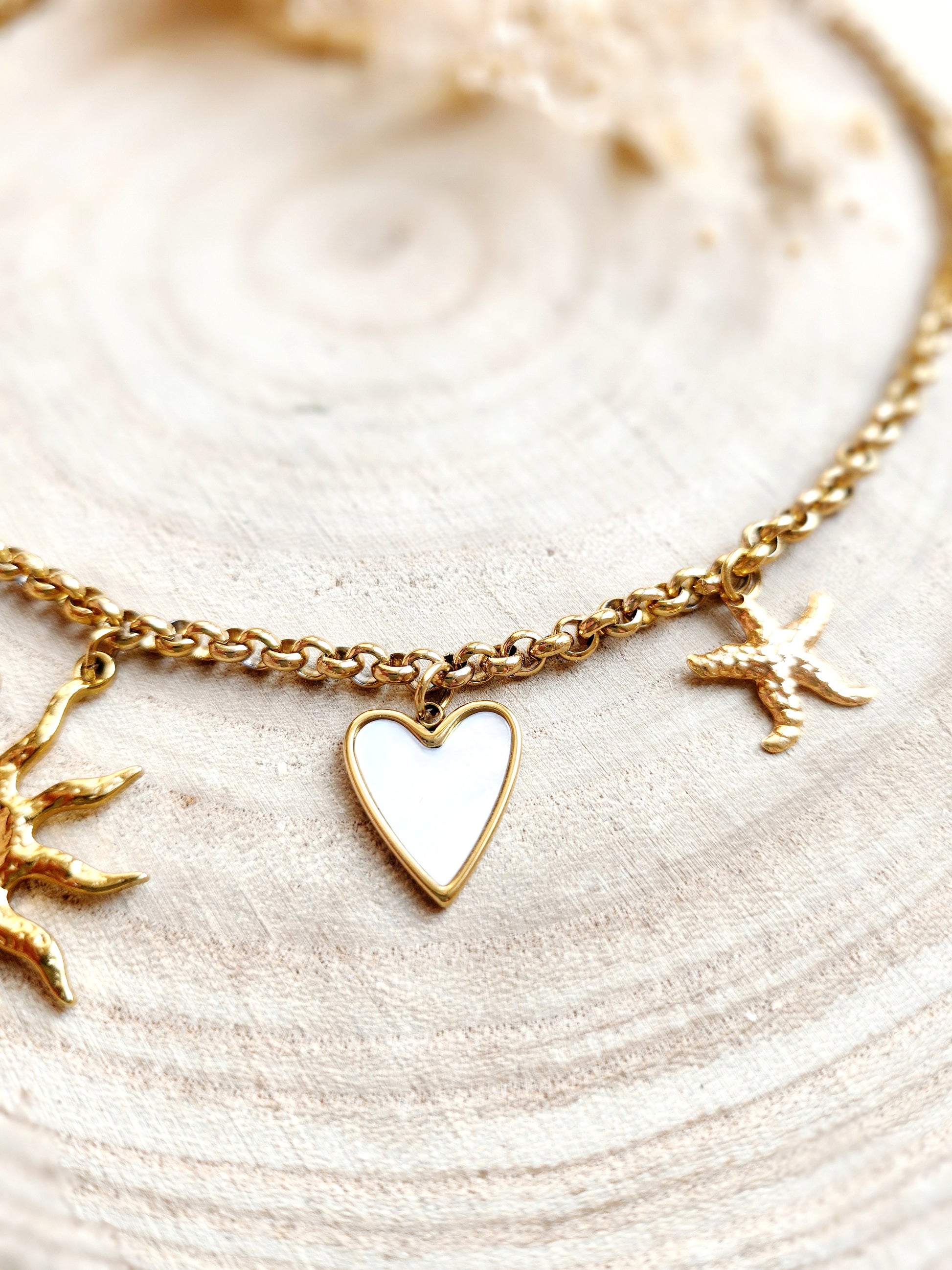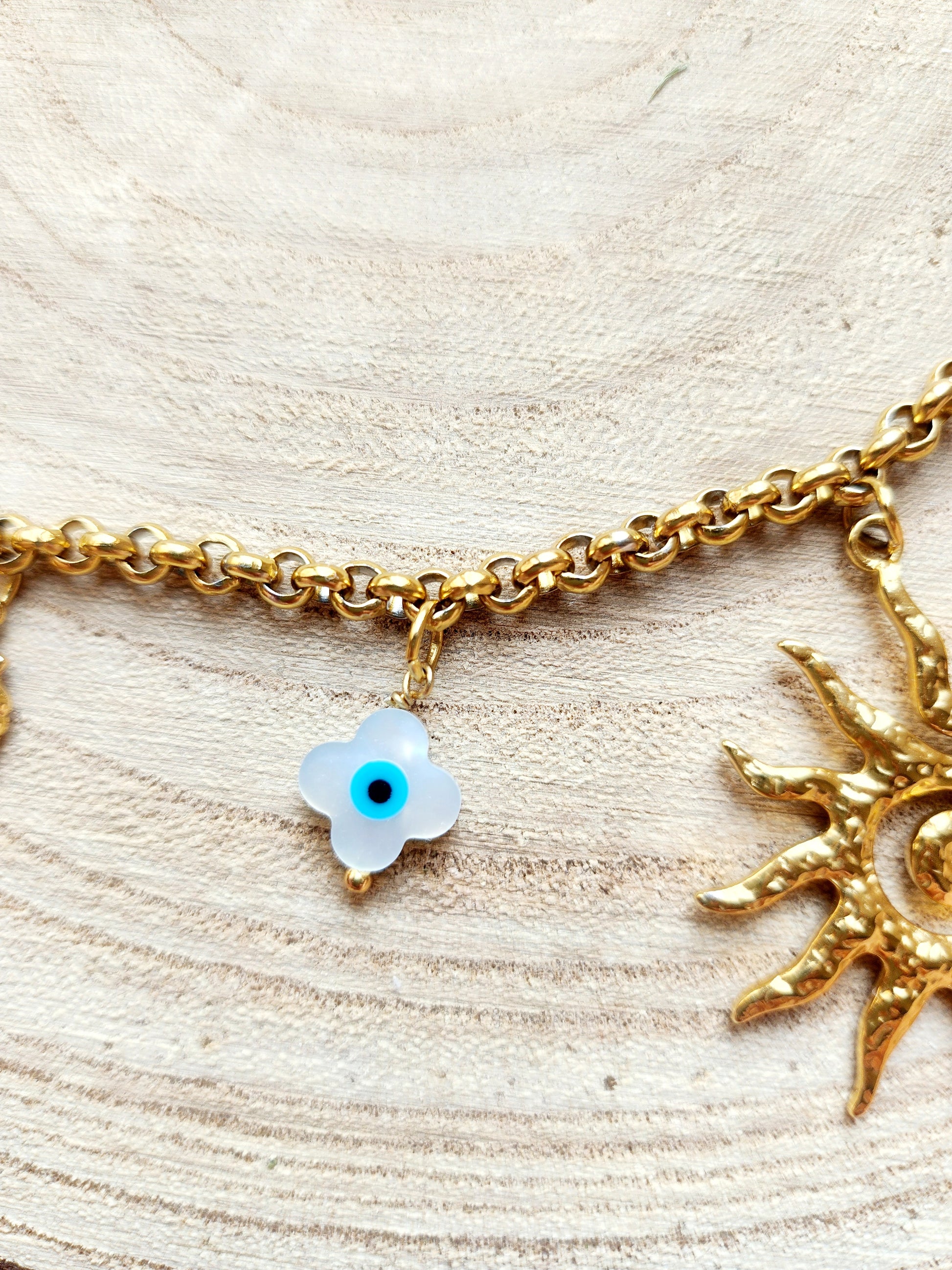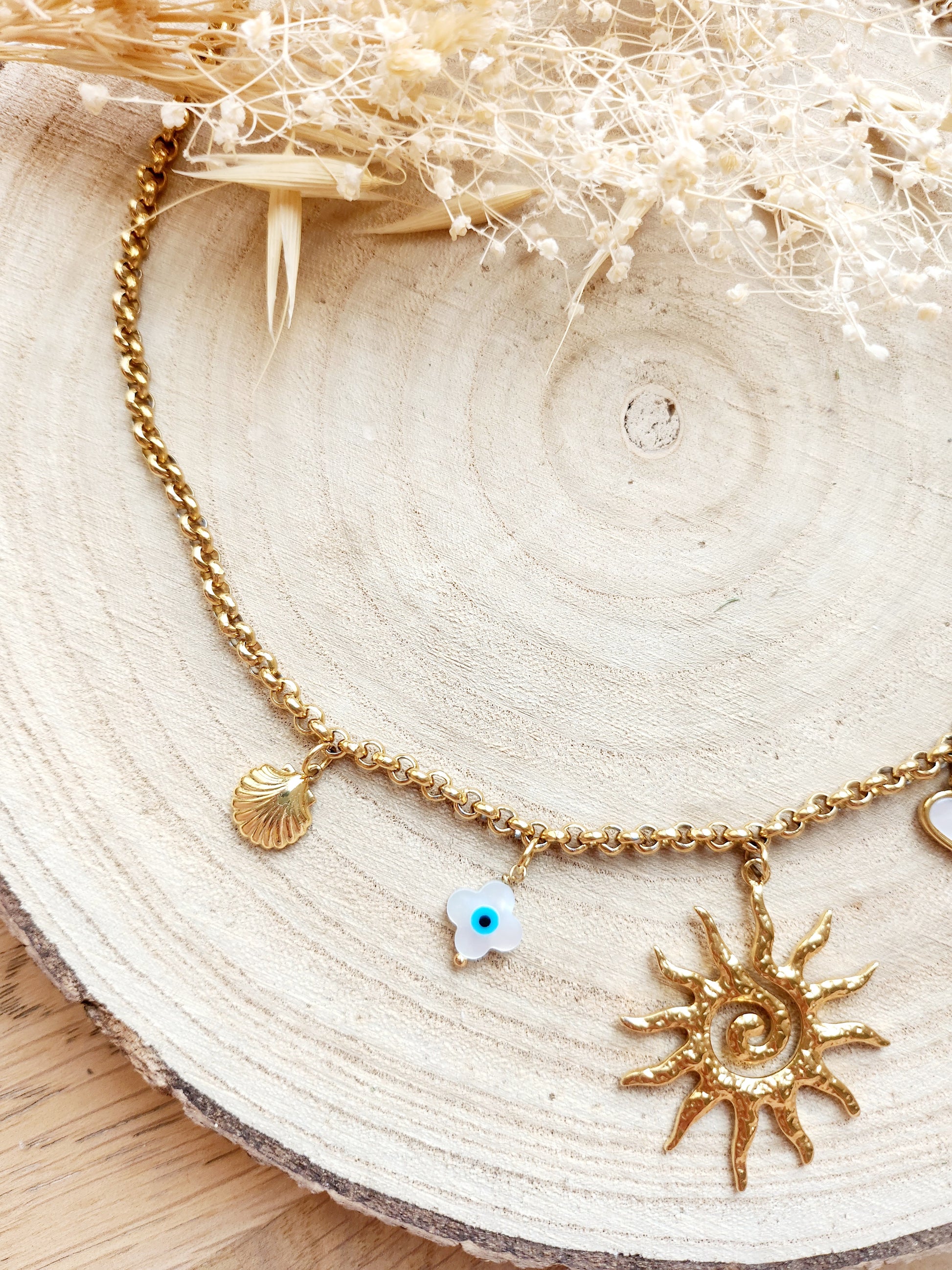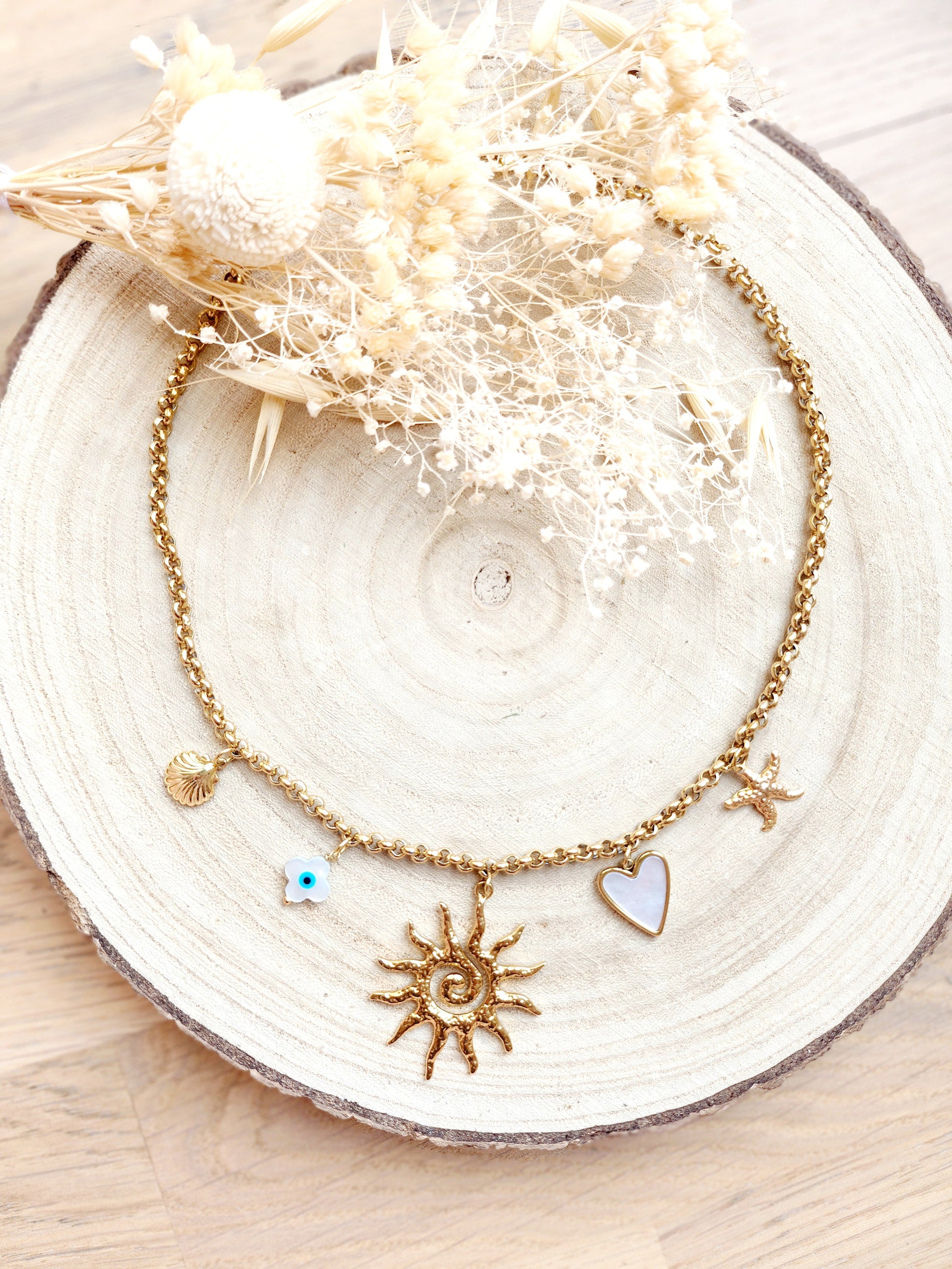 Chaine en acier inoxydable 💛 avec pendentifs en laiton doré à l’or fin et acier inox doré, hyper tendance cet été ✨